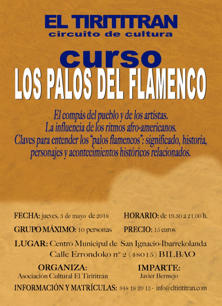 El Centro Municipal de San Ignacio-Ibarrekolanda, en Bilbao, acoge esta iniciativa de la Asociación Cultural El Tirititrán para dar a conocer los aspectos culturales que acompañan a distintas manifestaciones artísticas. En esta ocasión, se abordará el proceso de creación del flamenco: personajes y acontecimientos relevantes, el trabajo en el campo, las minas, etc.